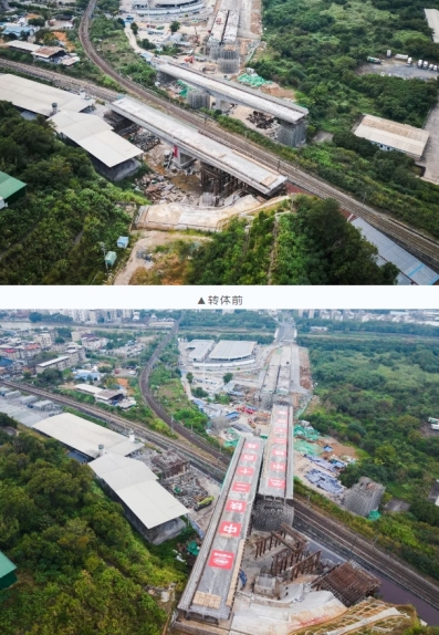 當(dāng)天7時04分,轉(zhuǎn)體橋梁開始轉(zhuǎn)體,經(jīng)過44分鐘施工,成功完成高空“二人轉(zhuǎn)”,為下一步順利實(shí)現(xiàn)通車運(yùn)營奠定堅(jiān)實(shí)基礎(chǔ)。轉(zhuǎn)體橋上跨既有漳龍線、龍東線及煤場專用線3條鐵路貨運(yùn)營業(yè)線,距離營業(yè)線最近距離僅5.9米,施工難度大,危險(xiǎn)系數(shù)高。