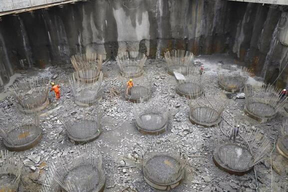 8月24日,繼龍巖大道高架橋主橋主塔樁基、承臺(tái)基坑開(kāi)挖完成后,項(xiàng)目已進(jìn)入主塔承臺(tái)施工階段,主橋封底混凝土澆筑完成0.75米(共1.5米)主橋轉(zhuǎn)體關(guān)鍵設(shè)備鑄鋼球鉸已生產(chǎn)完成,現(xiàn)場(chǎng)正進(jìn)行樁頭破除作業(yè)。由于連續(xù)橫跨贛龍鐵路、龍廈鐵路、羅龍東路、龍津河、雙洋路,主橋采用不對(duì)稱(chēng)跨塔梁同時(shí)轉(zhuǎn)體施工,其轉(zhuǎn)體總重達(dá)2.366萬(wàn)噸,轉(zhuǎn)體懸臂173.75m,施工難度巨大。為避免對(duì)城市道路及鐵路運(yùn)行的影響,主橋?qū)⒉捎貌粚?duì)稱(chēng)跨塔梁施工并分二次轉(zhuǎn)體,下一步進(jìn)行控制性工程為兩次主塔轉(zhuǎn)體施工。
